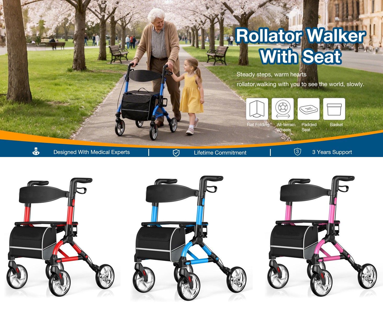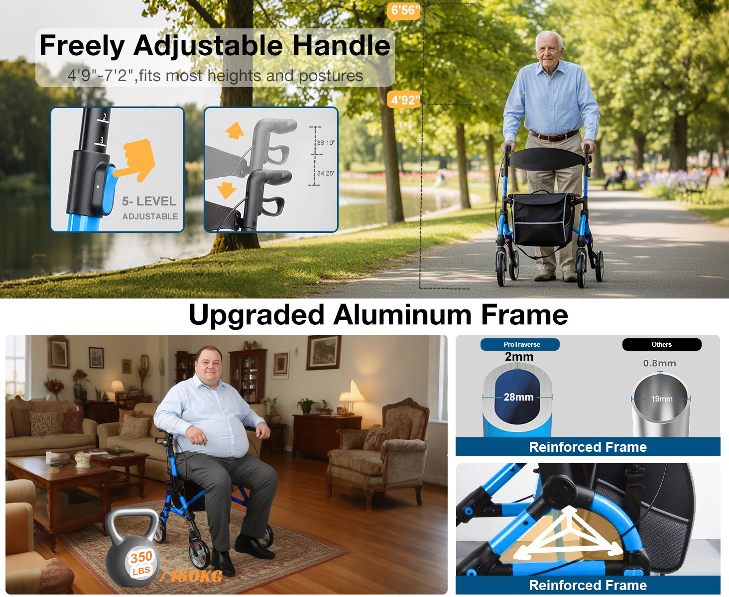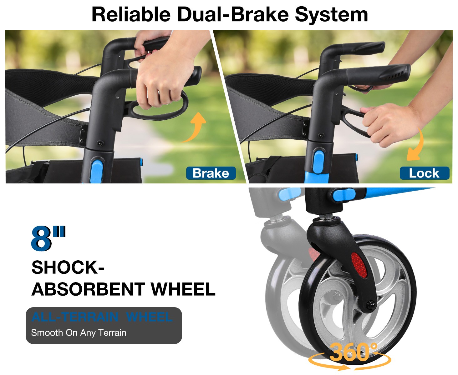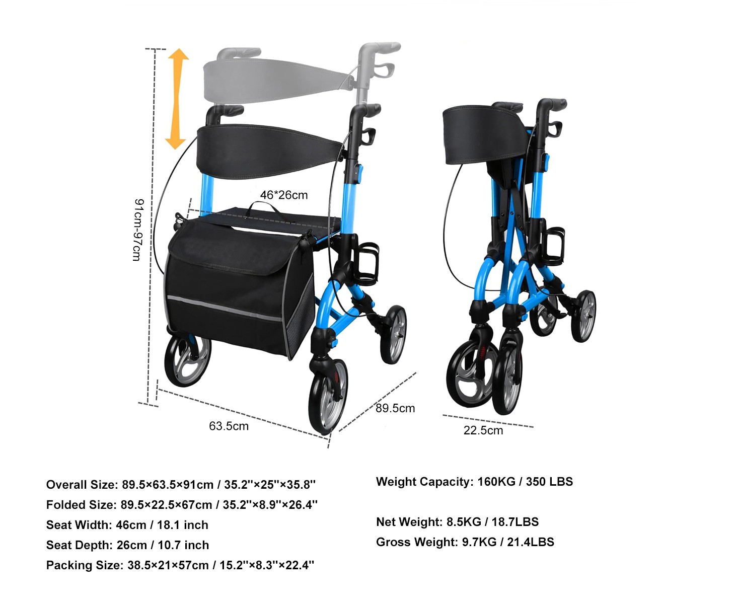 De plus, il est doté d'un siège confortable, d'un système de freinage de sécurité et d'un sac de rangement spacieux, permettant à l'utilisateur de se reposer et de transporter facilement ses effets personnels. Ce modèle allie style moderne et fonctionnalité, ce qui en fait une aide à la marche idéale pour une utilisation intérieure et extérieure.